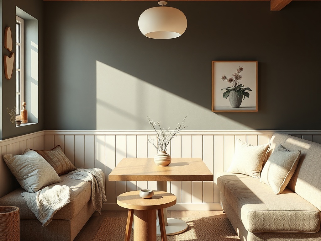 Современный интерьер с мягкой мебелью, растениями и ярким светом, создающим уютную атмосферу.