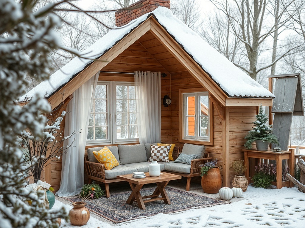 Деревянный дом с террасой снаружи и уютная комната с окнами и мягким диваном внутри.